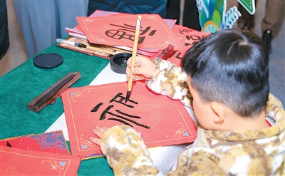 6岁的截瘫患儿周周(化名)拨动轮椅车轮,在展厅内兴奋地灵活穿梭。在中国康复研究中心北京博爱医院的书法疗愈展台前,他主动提起毛笔,在红纸上工整写下隶书“福”字送给记者,“我练书法一年半了,软笔硬笔都会!”